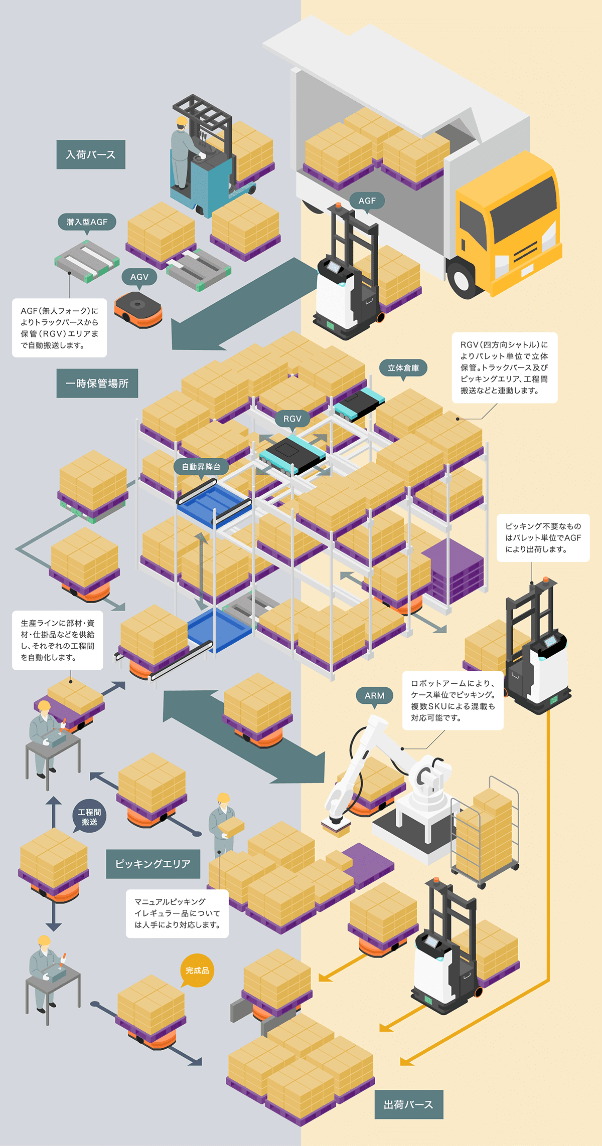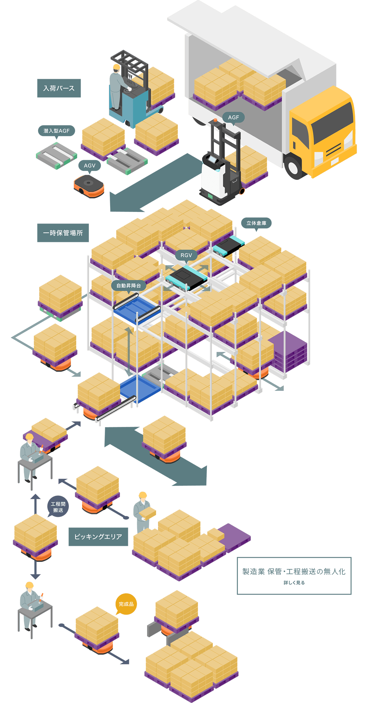 保管・工程搬送 RGV / AGV / ARM / AGF製造業向けに、トラックバース間の搬送、生産ラインへの供給、工程間搬送を行うソリューション。フォークリフト・ハンドパレット等が不要に。