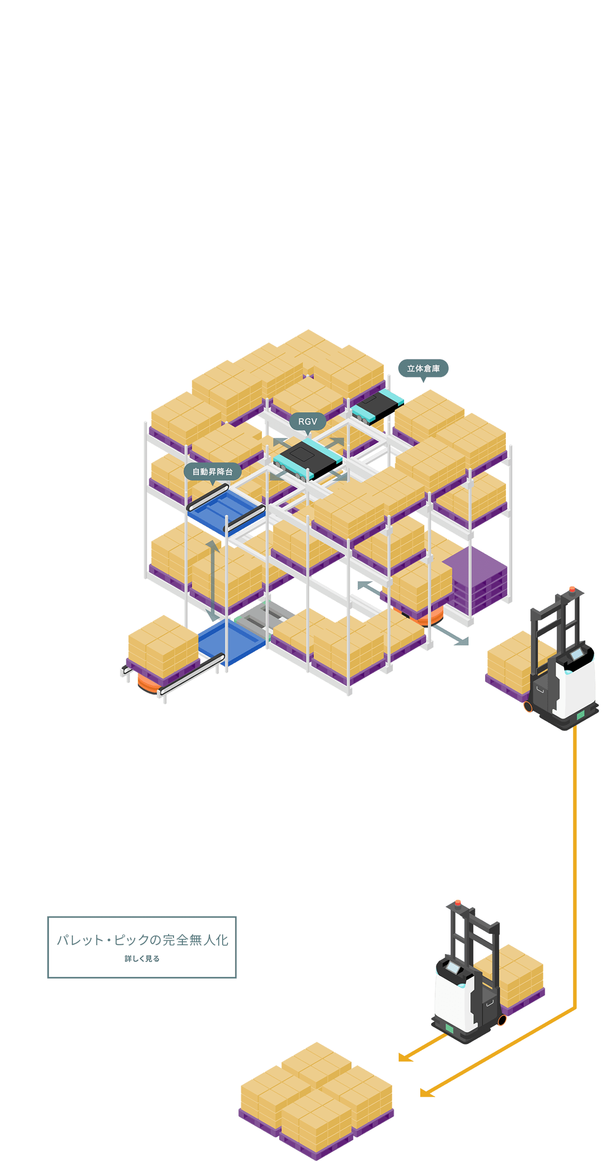 完全無人化 RGV / AGFRGVと無人フォークを組み合わせた完全無人パレット・ピッキング。