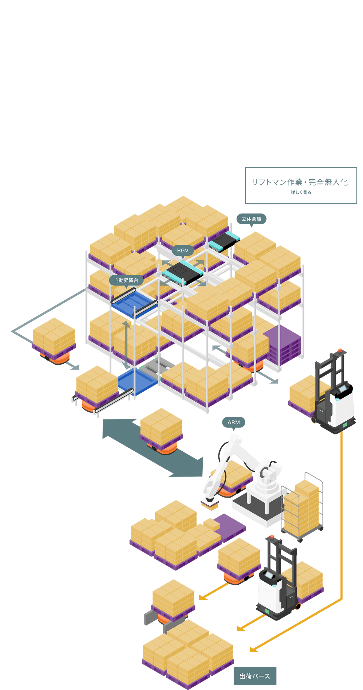 特に、50名以上のリフトマン完全無人化を実現した四国観音寺プロジェクトでは、RGV(四方向シャトル)・AGV・ロボアーム・AGF(無人フォーク)4種のロボットを全て連携させ、コスト削減・持続可能性を両立し、